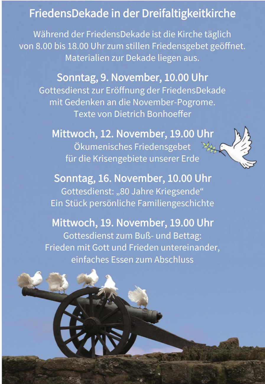 Bewusst verwenden wir nicht den Volksmundnamen „Totensonntag“, um deutlich zu machen: Es geht an diesem Sonntag um die Hoffnung, dass unsere Verstorbenen bei Gott für immer sicher und geborgen wohnen dürfen. Wenn Sie einen lieben Menschen verloren haben, der nicht in unserer Kirchengemeinde bestattet wurde, sagen Sie uns bitte Bescheid, dann werden wir auch diesen Namen im Gottesdienst verlesen und eine Kerze für ihn oder sie entzünden.